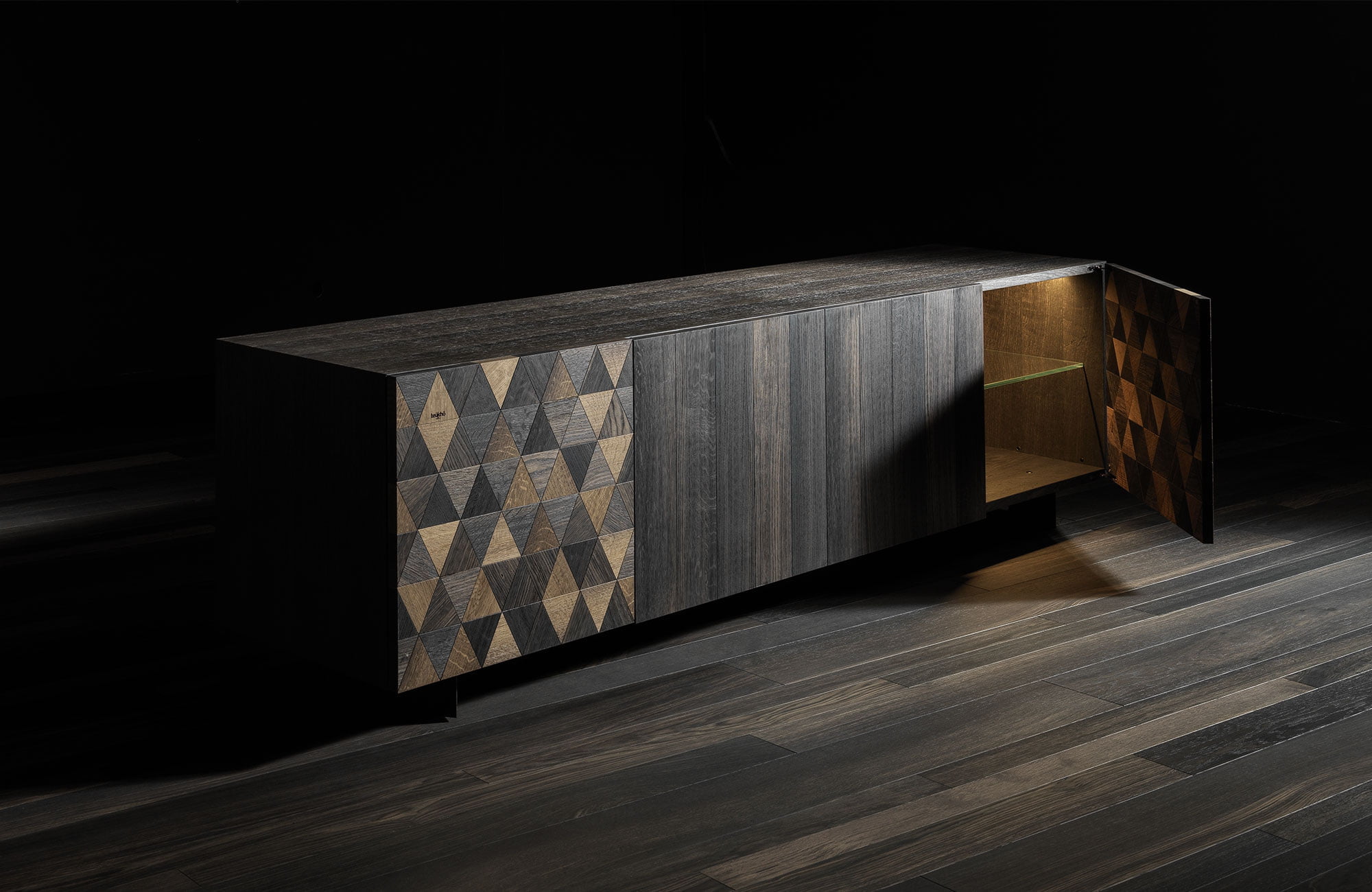 Teúkhō offre una incredibile gamma di mobili contenitori: dalle lineari credenze Trigono, alla credenza Selene, impreziosita con una pittura a tempera unica nel suo genere, alle madie Pelia, in cui il rovere fossile gioca con i materiali metallici per dare vita a contrasti e texture uniche.